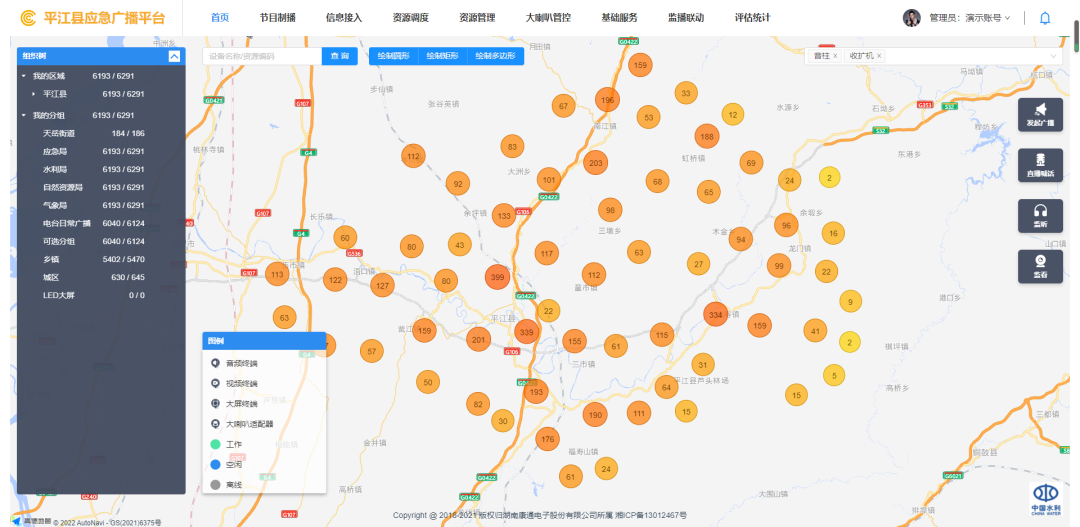 結(jié)合平江縣社會(huì)治理實(shí)際需求,特別在汨羅江平江縣城段流域增設(shè)“一江兩岸”禁漁禁捕、防溺水廣播點(diǎn)位;在平江縣城區(qū)主干道十字路口增設(shè)“城市文明創(chuàng)建”廣播點(diǎn)位;在平江縣境內(nèi)尾礦庫增設(shè)預(yù)警廣播點(diǎn)位。此外,還增設(shè)了水庫監(jiān)測廣播點(diǎn)位、地質(zhì)災(zāi)害廣播點(diǎn)位、戶外LED廣告大屏廣播點(diǎn)位,充分發(fā)揮多種社會(huì)治理場景下應(yīng)急廣播的指揮調(diào)度和信息發(fā)布作用。